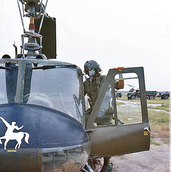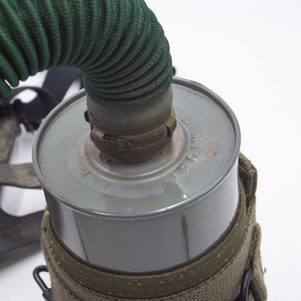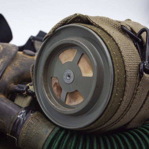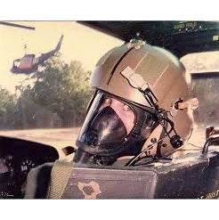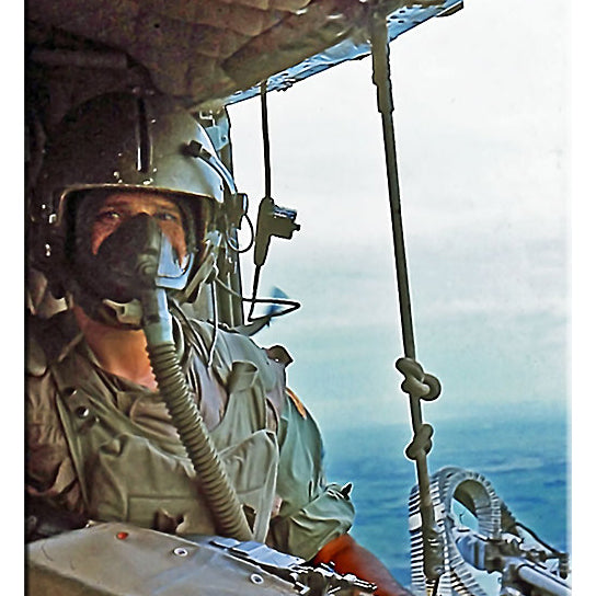 The M24 Aviator Gas Mask was standard issue for U.S. Army helicopter crews during Vietnam. Designed specifically for use in aircraft, it provided protection against airborne irritants, chemical agents, and tear gas encountered during reconnaissance, defoliation, and combat support missions. Aviators frequently relied on the M24 during operations involving CS gas grenades used to flush enemy forces from dense jungle cover. Helicopter crews would fly at extremely low altitude when deploying CS gas, using the downward rotor wash to force the chemical deeper into the dense jungle canopy. This technique was intended to flush out concealed enemy positions by driving the gas through thick vegetation.