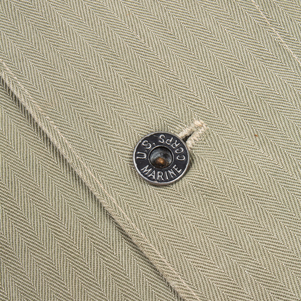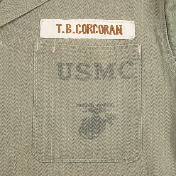 An original P41 jacket, made with 100% cotton selvedge HBT fabric. Displays originally applied name tape and pen-drawn corporal ranks. Named to T. B. Corcoran.