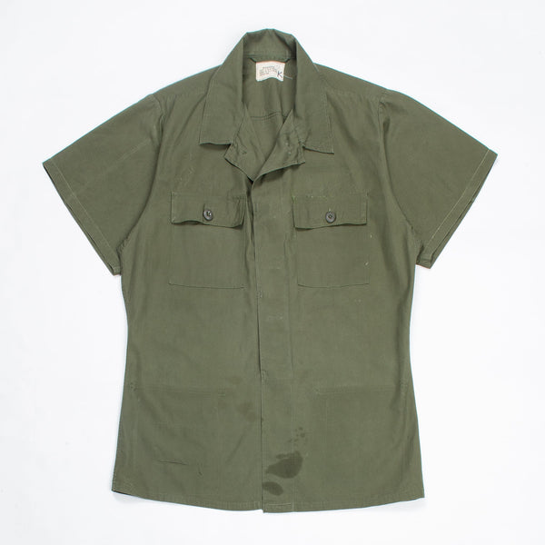 A 3rd pattern Tropical Combat Coat, heavily modified by a tailor to resemble a 1st pattern utility shirt. The bottom pockets were removed, sleeves shortened, and upper pockets modified to a basic exposed button patch pocket. A truly unique piece.