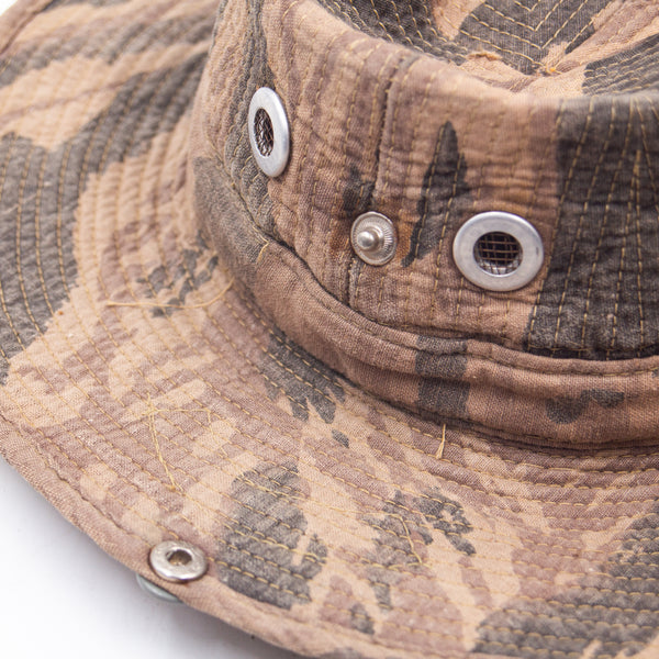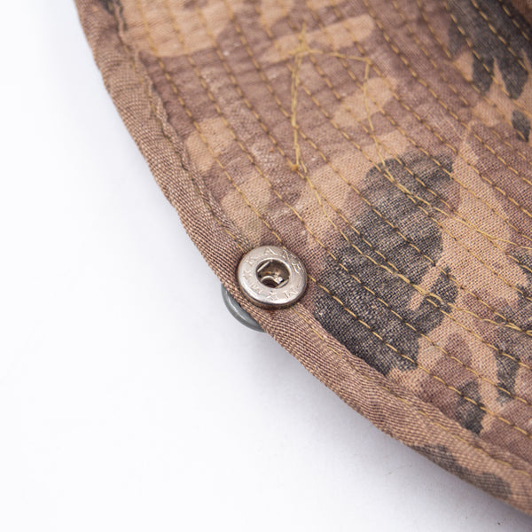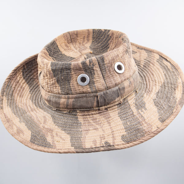 A lovely Vietnamese tailor-made cowboy/slouch hat made in a typical fashion with a local tigerstripe pattern. It has a vinyl sweatband, two large metal mesh screen eyelets on either side for ventilation, and a chin strap made from the same cloth as the rest of the hat. It displays a lovely woven ‘VIET-NAM’ rocker patch on the left side of the brim.