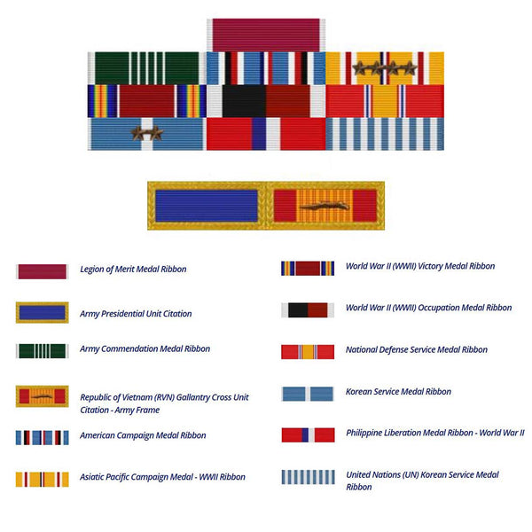 Worn by a decorated career cavalryman who entered service during the Second World War and saw extensive combat in the Pacific Theatre, participating in four campaigns and the liberation of the Philippines, followed by postwar occupation duty in Japan. He continued his career into the Korean War, serving in two campaigns and earning the United Nations and Korean Service Medals, before remaining on active duty through the post-Korea period and rising to the rank of colonel. His later service included senior command or staff responsibilities, reflected by the award of the Legion of Merit and Army Commendation Medal, and service with distinguished units recognised by a Presidential Unit Citation.
