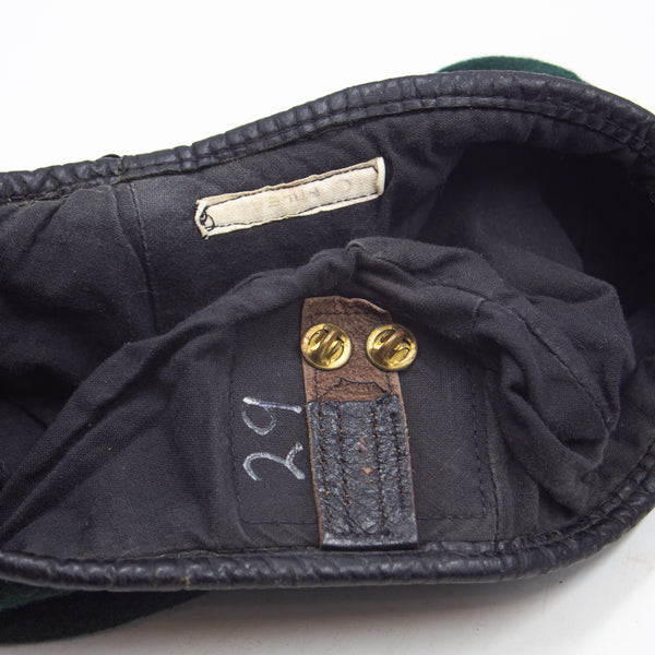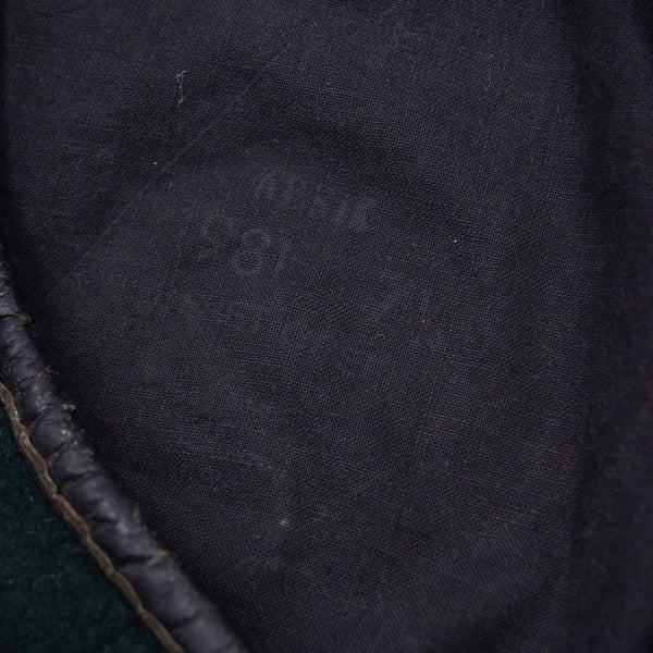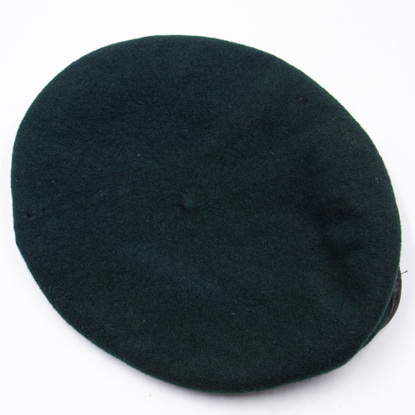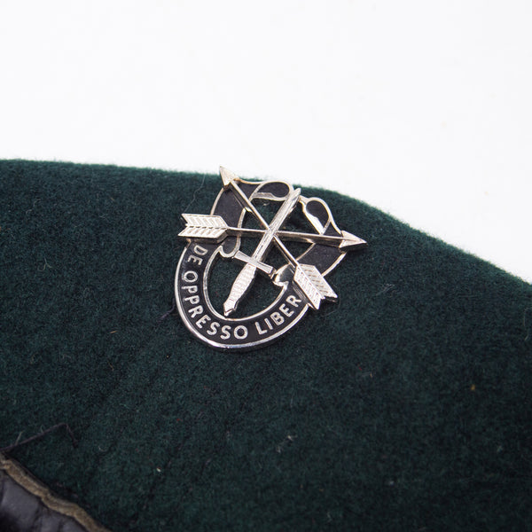 A genuine US Military issue green beret, made by Fleur De Lis in Ontario, Canada. Most berets produced prior to 1965 were made by this company, and they continued to make them throughout the Vietnam War and beyond. This example is dated 1981 and displays an originally applied Special Forces DI. There is a white name tag on the lining, but the name has mostly been worn away (Possibly C. Miles?).