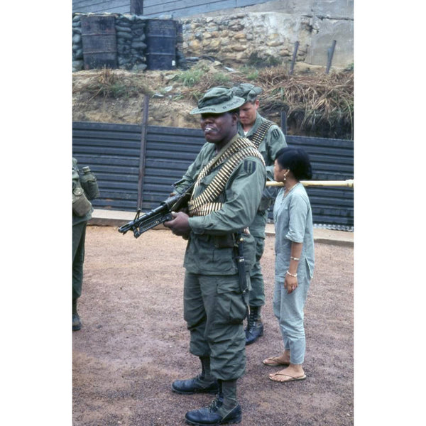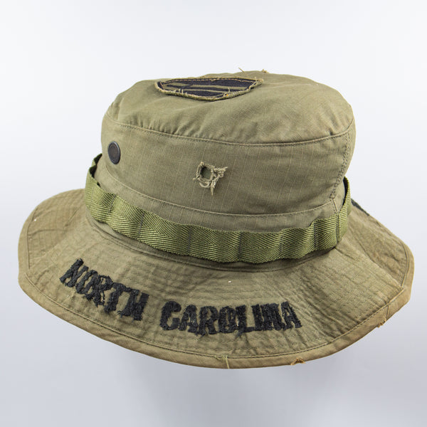 A customised, standard-issue boonie hat made from OG-107 ripstop cotton poplin, displaying an originally applied USARV patch and period embroidery reading “BROTHER GIBBS” (the original owner’s name) and “NORTH CAROLINA”, referencing his home state. The use of “Brother” as a self-identifier suggests Gibbs was likely an African American serviceman, aligning with common slang and cultural expression among black troops serving in Vietnam.